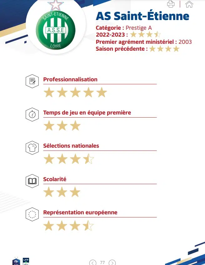 Finalement, l'ASSE se classe derrière le Stade Rennais, l'Olympique Lyonnais et les Girondins de Bordeaux dans ce classement. Les 3 clubs disposent de 4 étoiles en note générale. Ils se positionnent à la même hauteur que le PSG, l'ASM et le Havre avec 3 étoiles et demi de moyenne. Une performance remarquable qui souligne l'excellent travaille réalisé à la formation depuis de nombreuses saisons.