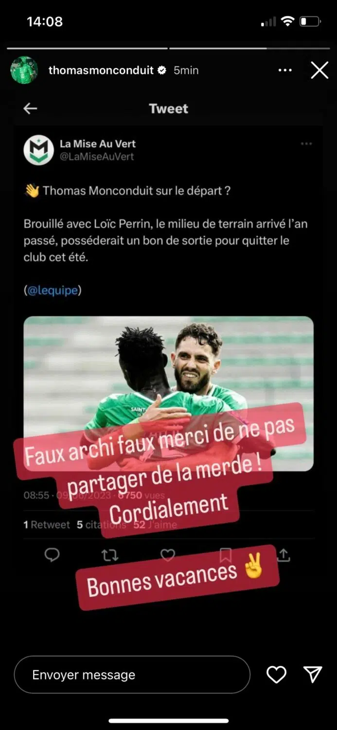 Alors que le board stéphanois travaille pour préparer au mieux la prochaine saison, Bernard Lions a publié un article ce matin dans lequel il évoque des tensions entre Loïc Perrin (coordinateur Sportif) et Thomas Monconduit (milieu de terrain des Verts) :