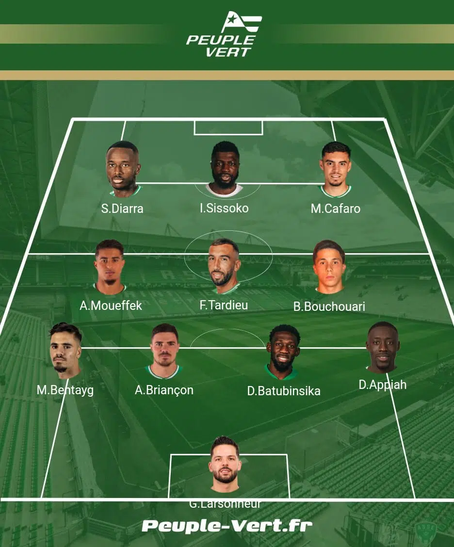 Un doute existe entre Lamine Fomba et Aimen Moueffek pour le troisième titulaire. Avec sa bonne entrée et son but salvateur ainsi que la possible suspension de Lamine Fomba contre Laval, le coach stéphanois devrait aligner le milieu de terrain franco-marocain lors de cette rencontre. Décisif et débarrassé de ses pépins physiques, il pourrait aspirer à davantage de temps de jeu dans les semaines à venir.