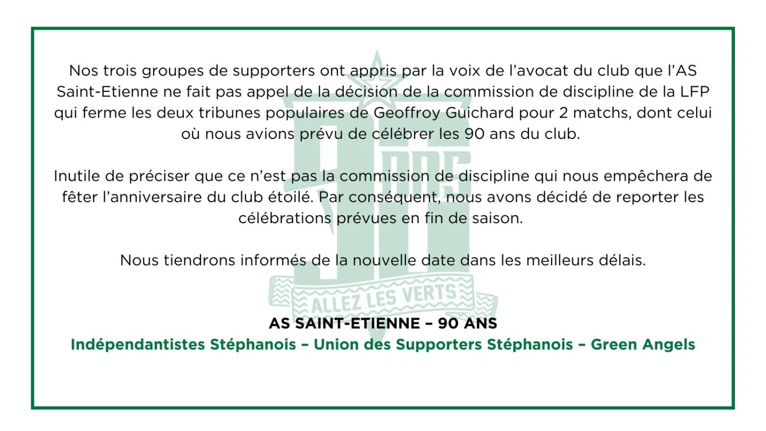 "Nos trois groupes de supporters ont appris par la voix de l'avocat du club que l'AS Saint-Etienne ne fait pas appel de la décision de la commission de la LFP qui ferme les deux tribunes populaires de Geoffroy-Guichard pour 2 matchs, dont celui où nous avions prévu de célébrer les 90 ans du club.