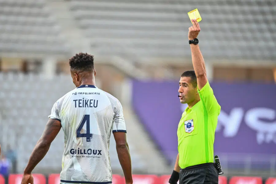 Referee Alexandre PERREAU NIEL gives a yellow card to Adolphe TEIKEU of Caen during the Ligue 2 BKT match between Paris FC and Caen at Stade Charlety on August 27, 2022 in Paris, France. (Photo by Anthony Dibon/Icon Sport)