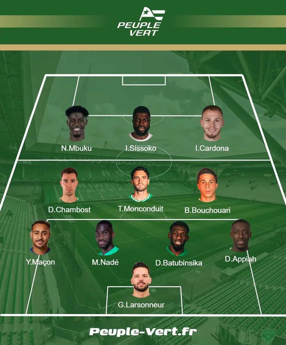 Victime d’une petite lésion aux ischio-jambiers, Anthony Briançon est absent du groupe et est laissé au repos ce week-end. C’est Dylan Batubinsika qui sera en défense centrale pour remplacer le capitaine des verts. Le défenseur congolais va retrouver une place de titulaire après être parti à la CAN. À côté de lui, Mickaël Nadé sera titularisé. Le défenseur passé par QRM a encore réalisé une belle prestation face à Annecy. Dennis Appiah et Yvann Maçon vont de nouveau enchaîner une titularisation respectivement à droite et à gauche de La défense stéphanoise.