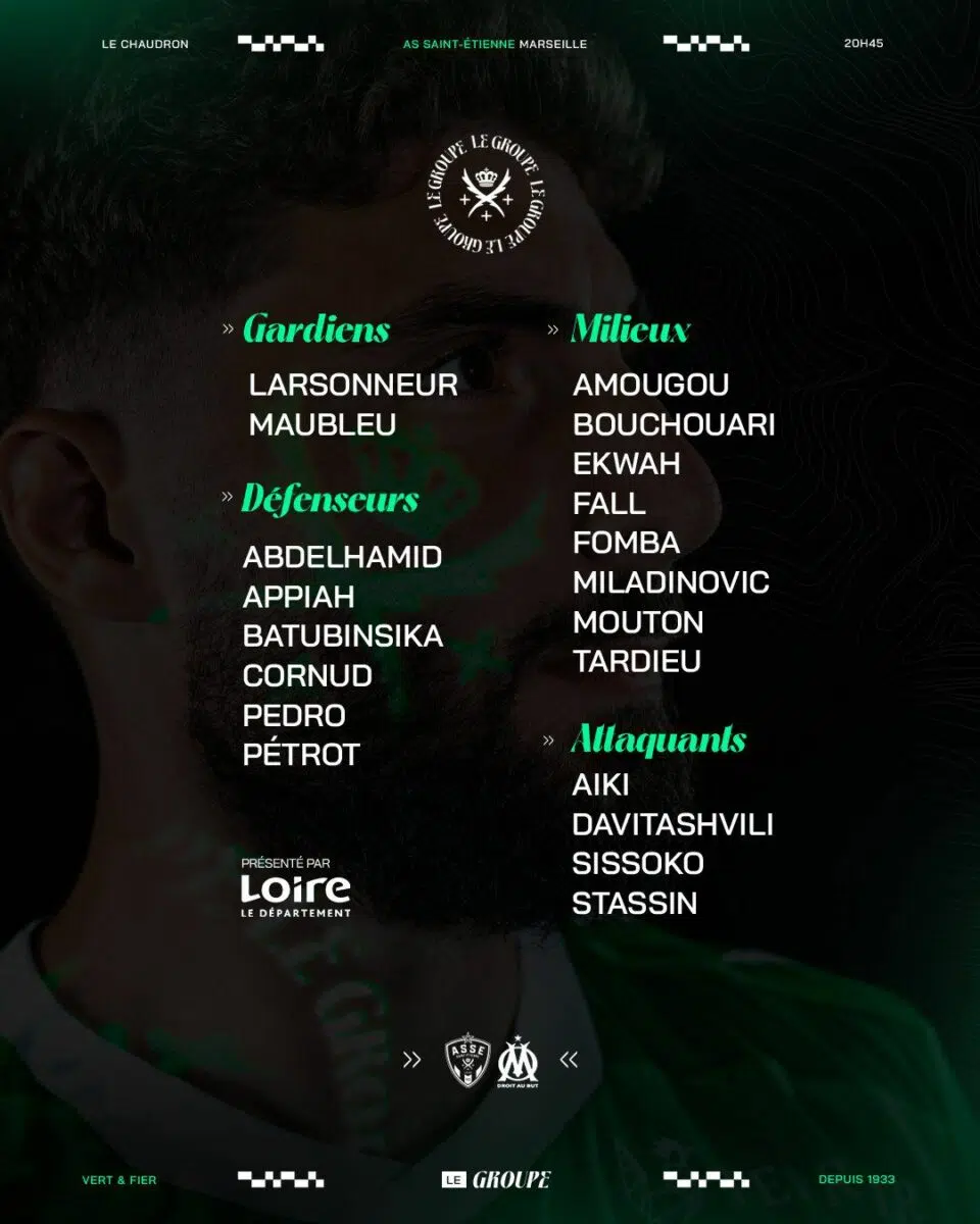 Les dernières échéances de la saison 2024 sont en cours. Les coéquipiers de Gautier Larsonneur doivent encore jouer deux rencontres de ligue 1. L'ASSE affronte l'Olympique de Marseille en prime time ce dimanche à 20h45. Voici le groupe retenu par Dall'Oglio pour cette rencontre de la 14e journée de ligue 1.