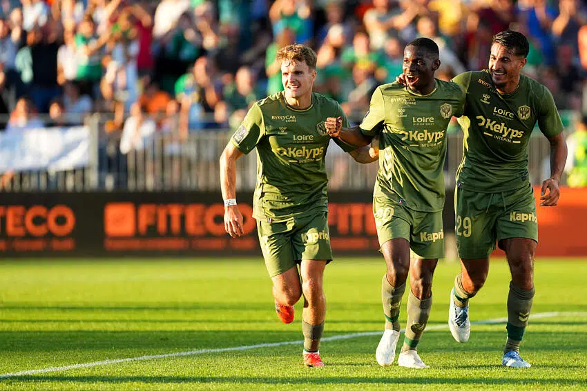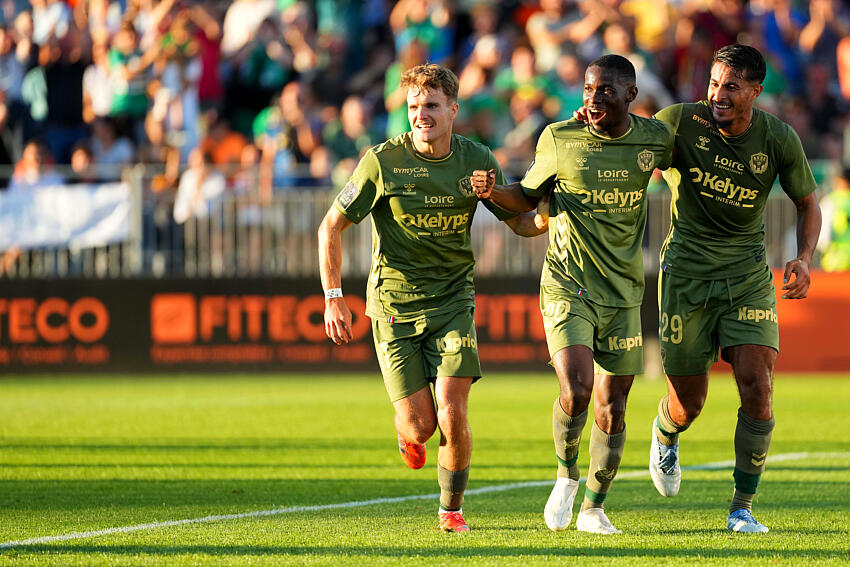 29 Aimen MOUEFFEK (asse) - 20 Augustine BOAKYE (asse) - 11 Ben OLD (asse) during the Ligue 2 BKT match between Laval and Saint-Étienne at Stade Francis-Le Basser on August 9, 2025 in Laval, France. (Photo by Dave Winter/FEP/Icon Sport)