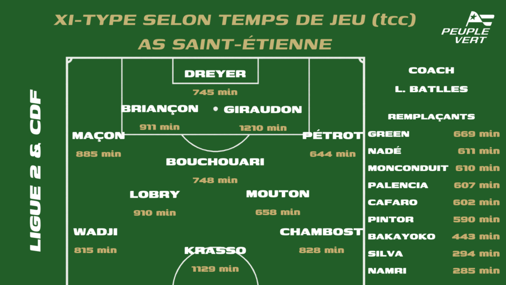 Alors qu'au début de saison Laurent Batlles faisait beaucoup tourner son effectif entre joueurs fraîchement arrivés et joueurs sur le départ (Bouanga, Camara, Neyou, Aouchiche...), le coach stephanois a au fur et à mesure stabilisé son équipe et se dessine petit à petit une équipe-type ou en tout cas une colonne vertebrale.