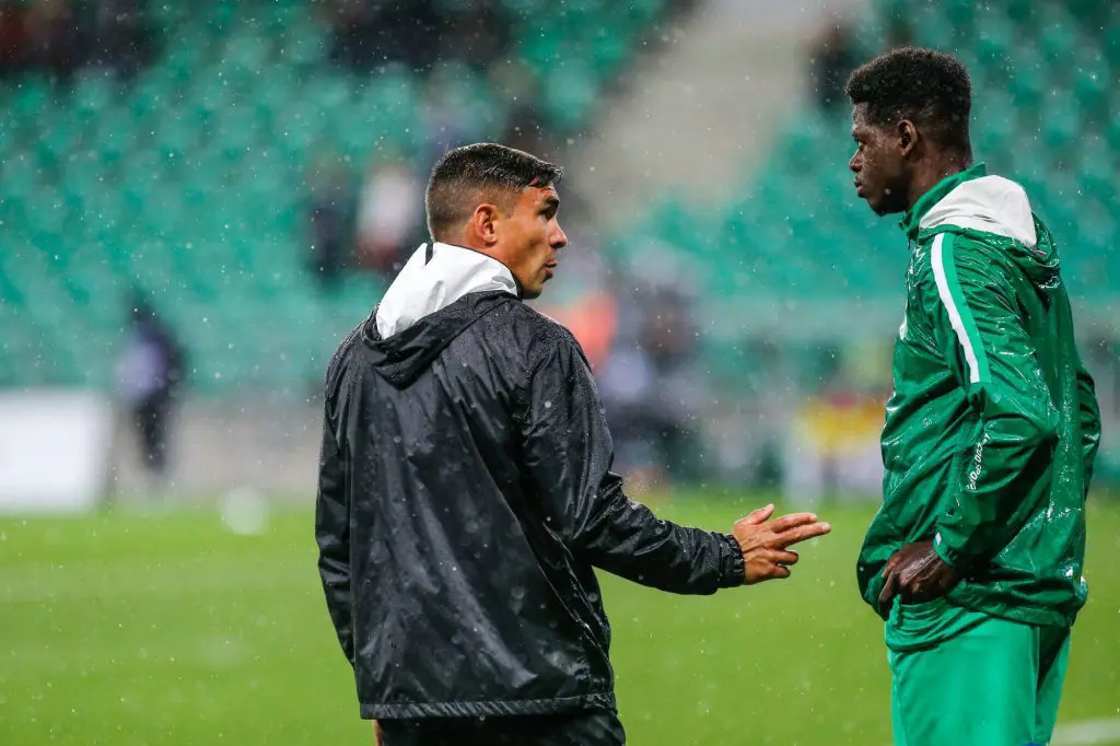 Sebastien SANGNIER physic trainer and Saidou SOW of Saint Etienne before the Ligue 1 Uber Eats match between Saint Etienne and Lyon at Stade Geoffroy-Guichard on October 3, 2021 in Saint-Etienne, France. (Photo by Johnny Fidelin/Icon Sport) - Stade Geoffroy-Guichard - Saint Etienne (France)