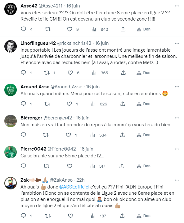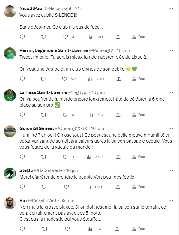 C'est que pour mettre en avant les valeurs de l'ASSE durant cette saison, il fallait tout de même un certain culot. Pour preuve, les nombreux tweets qui ont commenté la publication du club et qui appellent à davantage... d'humilité justement :