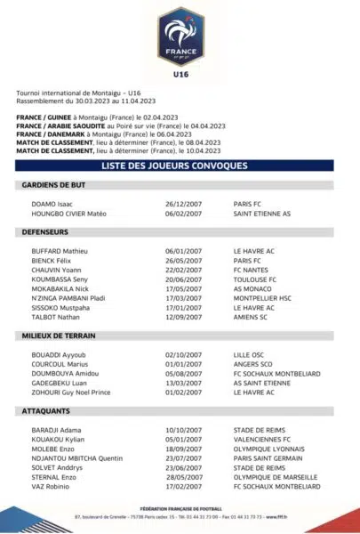 Il sera accompagné cette fois-ci d'un de ses coéquipiers en la personne de Mateo Houngbo Civier. Le gardien stéphanois a déjà remporté le tournoi de Montaigu la saison dernière avec la génération 2006 du club. Il tentera de faire bonne figure cette année avec la sélection