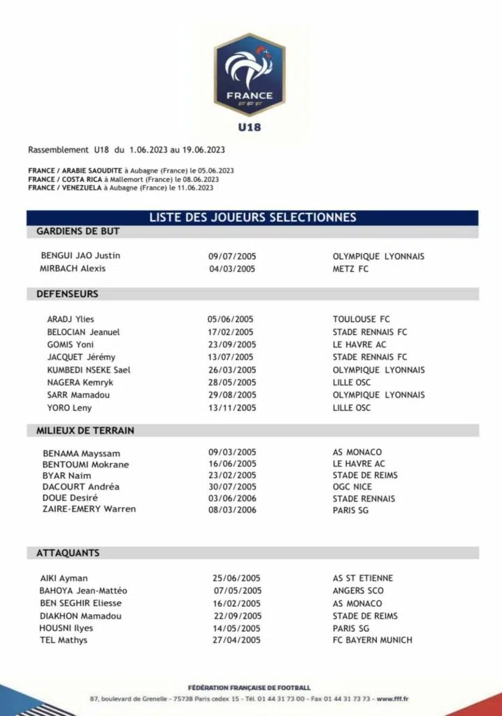 Alors que l'équipe de France U20 a disputé la coupe du monde en Argentine, la FFF a décidé d'envoyer l'équipe U18 de Bernard Diomède au tournoi Maurice Ravello (ex tournoi de Toulon). Un tournoi qu'Adil Aouchiche et sa bande avaient remporté la saison dernière. Pour remettre leur titre en jeu, les bleus iront avec une équipe jeune, mais très talentueuse parmi laquelle se trouve Ayman Aiki le stéphanois.