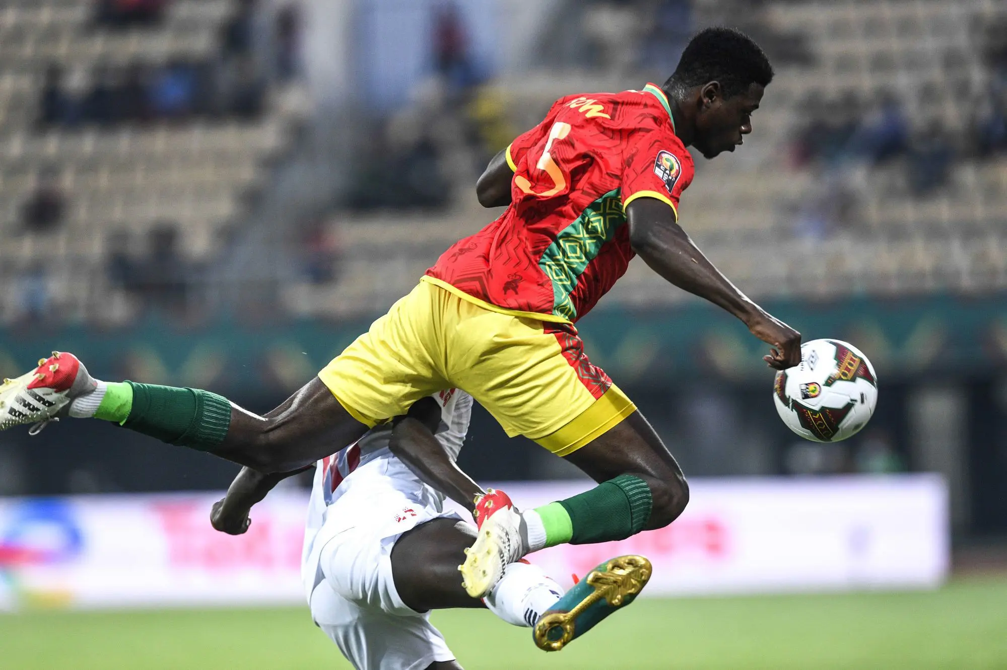 Modou Barrow of Gambia challenged by Saidou Sow of Guinea during the 2021 Africa Cup of Nations Finals Last 16 match between Guinea and Gambia on the 24 January 2022 at Kouekong Omnisports Stadium, Bafoussam, Cameroon / Pic Sydney Mahlangu/Sports Inc - Photo by Icon sport