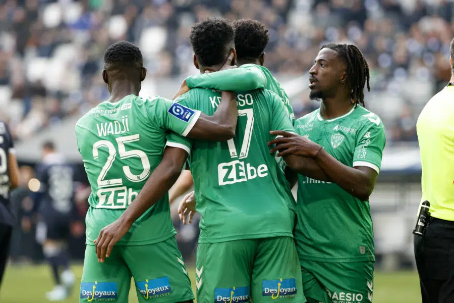 11 Abdoul Kader BAMBA (asse) - 17 Jean-Philippe KRASSO (asse) during the Ligue 2 BKT match between Bordeaux and Saint Etienne at Stade Matmut Atlantique on March 4, 2023 in Bordeaux, France. (Photo by Romain Perrocheau/FEP/Icon Sport)