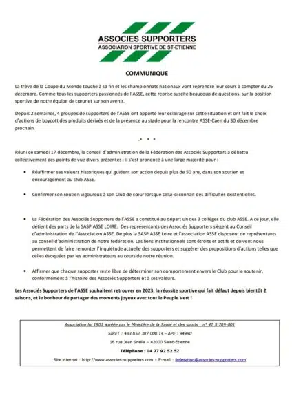 Kop Nord, Kop Sud, Henri-Point, plus aucune place ne doit se vendre pour ASSE-Caen le 30 décembre prochain. Nous appelons également l'ensemble des abonnés à ne pas se rendre au stade. Il est grand temps pour nous de positionner tous ces coupables face à leurs responsabilités !