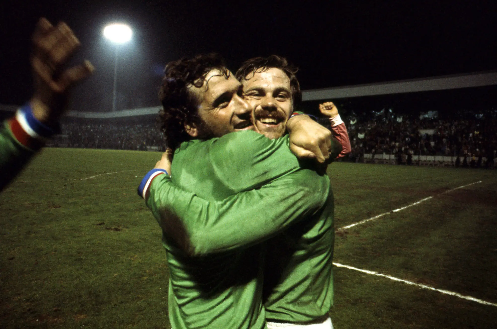 Christian Lopez and Herve Revelli celebrate victory during the European Cup Semi Final match between Saint Etienne and PSV Eindhoven on 15th April, 1976 in Saint Etienne ( Photo by Georges Beutter / Onze / Icon Sport )
