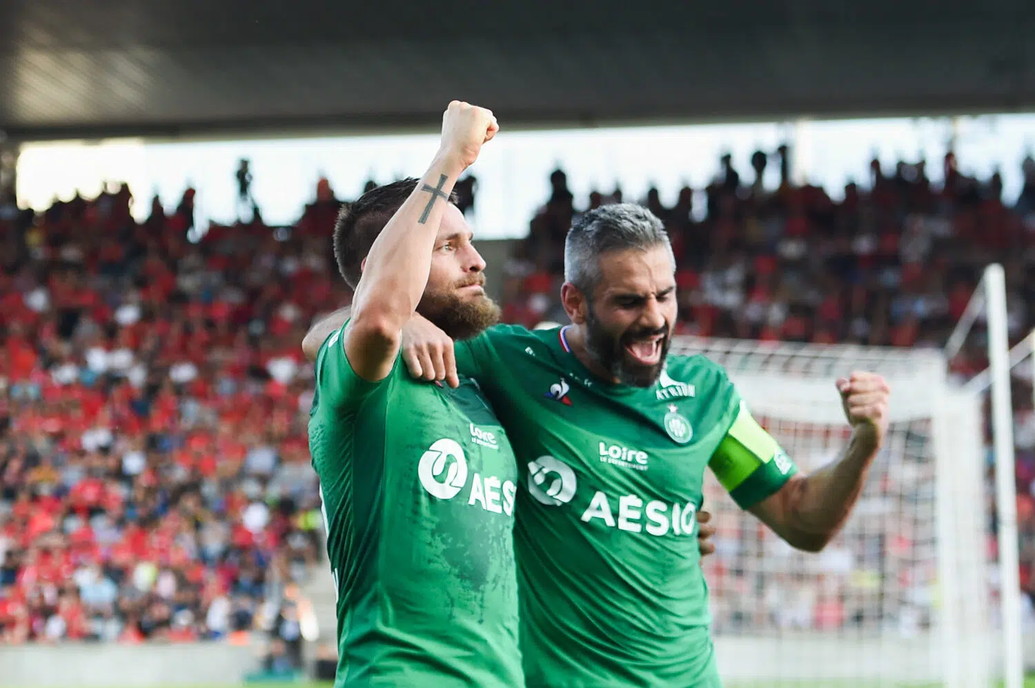 Mathieu DEBUCHY of Saint-Etienne celebrates his scoring with Loic PERRIN of Saint-Etienne during the Ligue 1 match between Nimes and Saint Etienne on September 29, 2019 in Nimes, France. (Photo by Alexandre Dimou/Icon Sport)