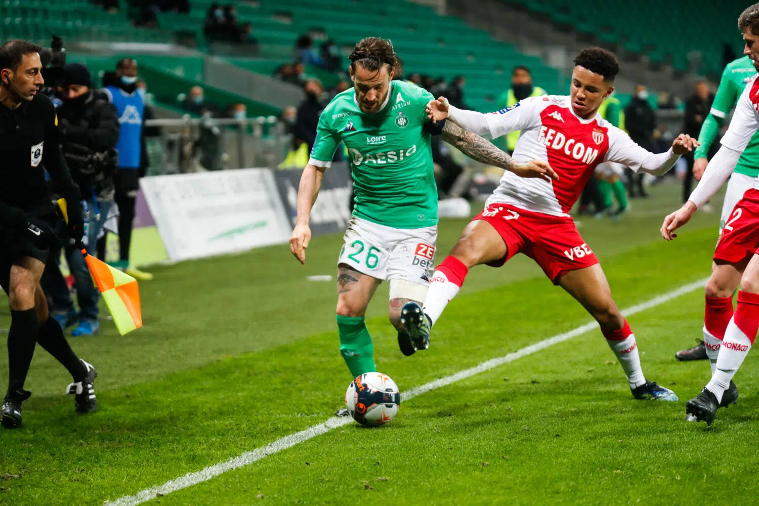 Mathieu DEBUCHY of Saint Etienne and Sofiane DIOP of Monaco during the Ligue 1 match between AS Saint-Etienne and AS Monaco at Stade Geoffroy-Guichard on March 19, 2021 in Saint-Etienne, France. (Photo by Romain Biard/Icon Sport)
