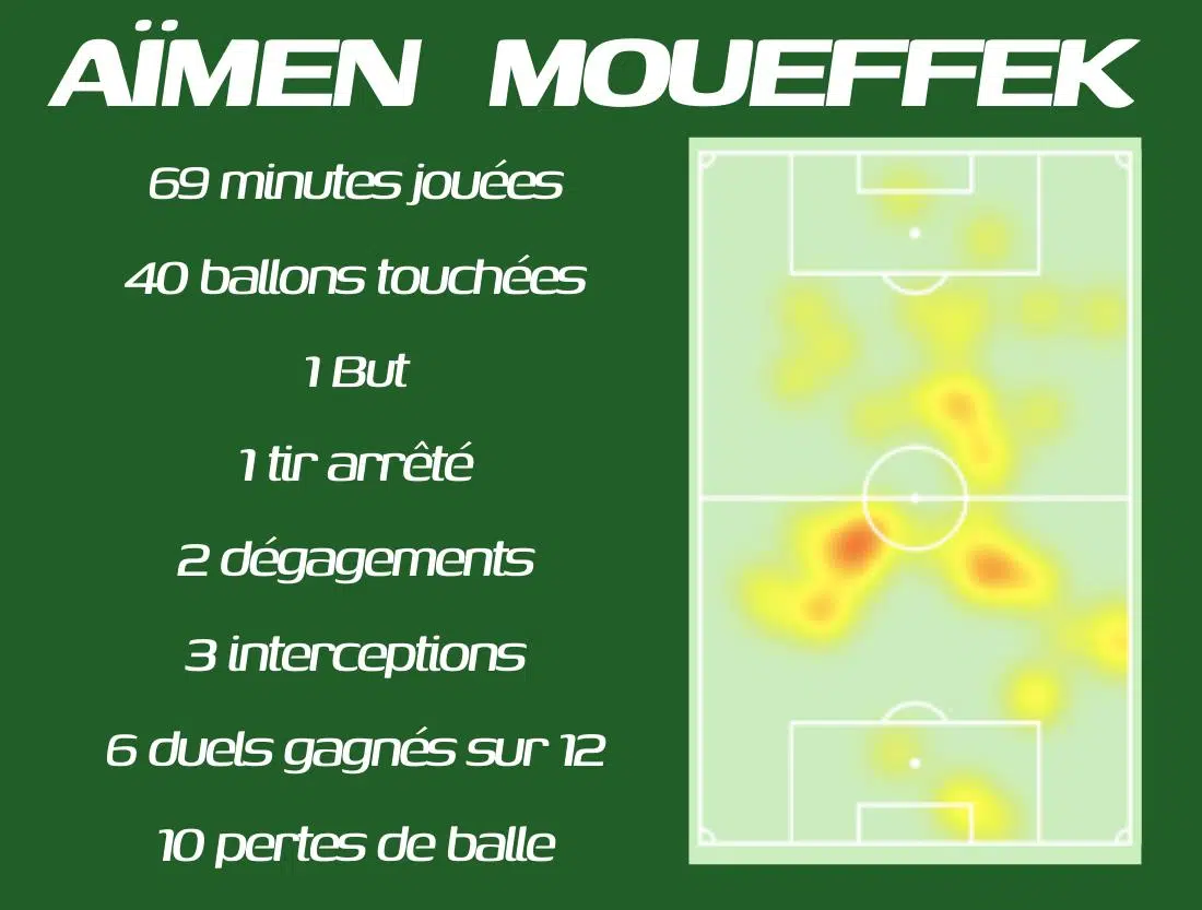 Moins concerné par la récupération, il aurait clairement dû se montrer plus à son avantage et incarner une rampe de lancement pour Bamba, Cafaro et Nkounkou. A la peine techniquement, il n'a jamais pesé sur la rencontre et a contribué à ce que les Verts subissent au milieu de terrain. À l'inverse, sans faire un grand match, Aïmen Moueffek a rendu une copie beaucoup plus conforme au rôle qui lui était attribué, profitant même d'un corner pour inscrire son premier but en professionnel.
