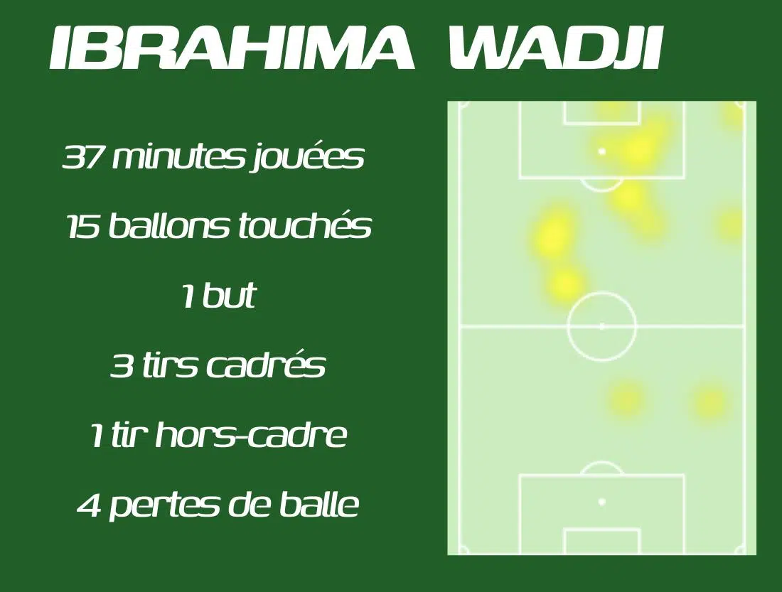 Alors qu'on a souvent pointé du doigt la maladresse d'Ibrahima Wadji, il s'avère depuis quelques semaines un buteur redoutable et finisseur très habile. Souvent très bien placé, il a cadré à trois reprises pour 4 tentatives, faisant mouche une fois pour inscrire le troisième but stéphanois.