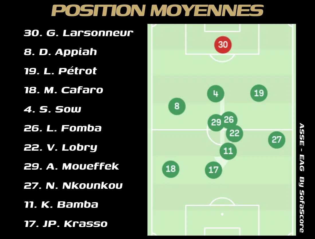 Il y avait d'un côté la paire Nkounkou-Pétrot qui se devait d'occuper le secteur gauche de la défense stéphanoise et de l'autre, Cafaro-Appiah. Si les statistiques sont flatteuses pour Cafaro et Nkounkou, elles sont néanmoins éloignées de la performance réelle des deux joueurs. Nkounkou a joué davantage en retrait que Cafaro. Le profil très (trop ?) offensif de Mathieu Cafaro se traduit par une présence quasi exclusive dans le camp adverse, laissant Dennis Appiah se charger des deux clients du jour, à savoir Livolant et Gaudin. Inévitablement, c'est du côté droit de la défense que sont arrivés les deux buts guingampais. Certes, Cafaro a marqué en toute fin de match, mais sa propension à monter haut sans organiser de repli efficace a eu pour conséquence d'isoler Appiah et de le mettre sous pression à chaque récupération adverse, permettant des décalages comme c'est notamment arrivé sur le premier but d'El Ouazzani.