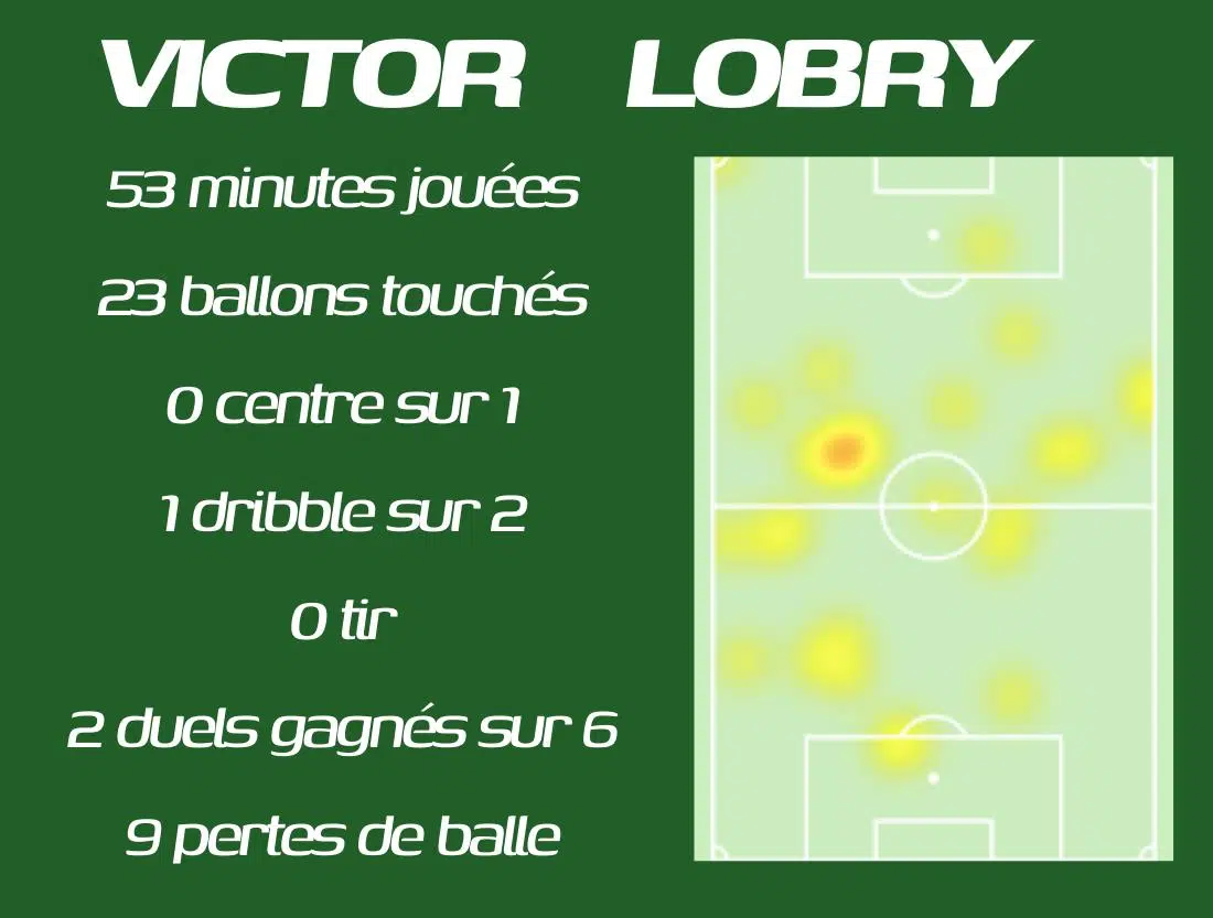 Alors qu'il était attendu pour sa disponibilité et dans la sortie de balle, Victor Lobry a réussi à toucher presque deux fois moins de ballons en 53 minutes de jeu que Moueffek qui en a joué 69.