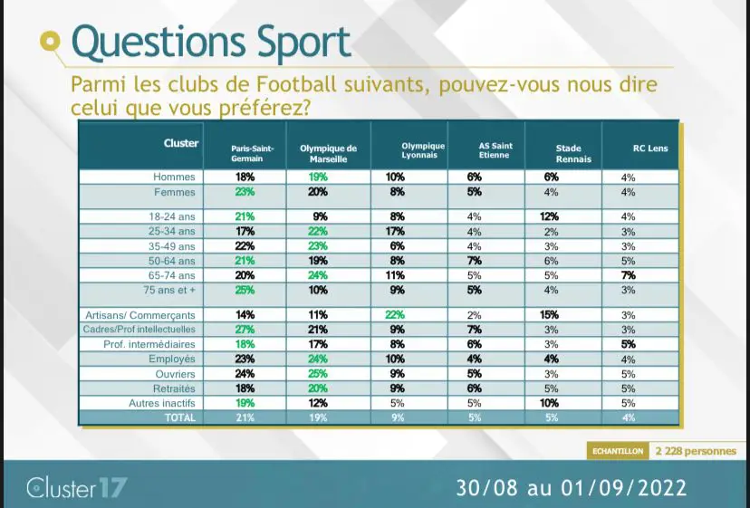 Parmi les 5% avoir répondu préférer l'ASSE, la majorité sont des hommes de plus de 50 ans. Sans surprise, es nouvelles génération apprécient davantage le PSG, l'OM ou encore ...l'OL.