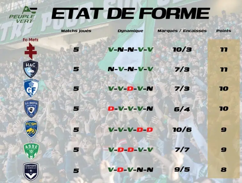 Si l'AS Saint-Etienne reste friable, la dynamique sur 2023 est relativement bonne. Les Verts présentent le sixième meilleur bilan sur les 5 dernières rencontres. Trois victoires, deux défaites. 9 points sur 15 possibles. 7 buts marqués pour autant encaissés.