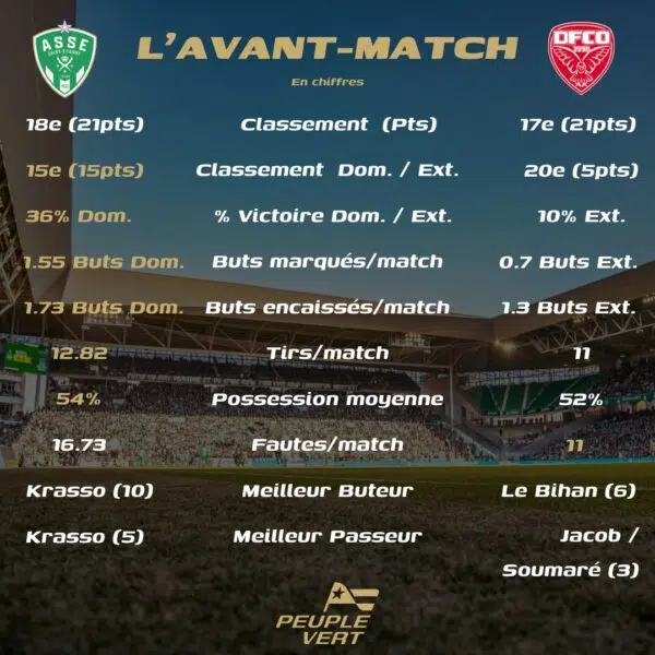 • Moyenne de buts marqués : ASSE (1.41/match) vs. Dijon (0.95/match)