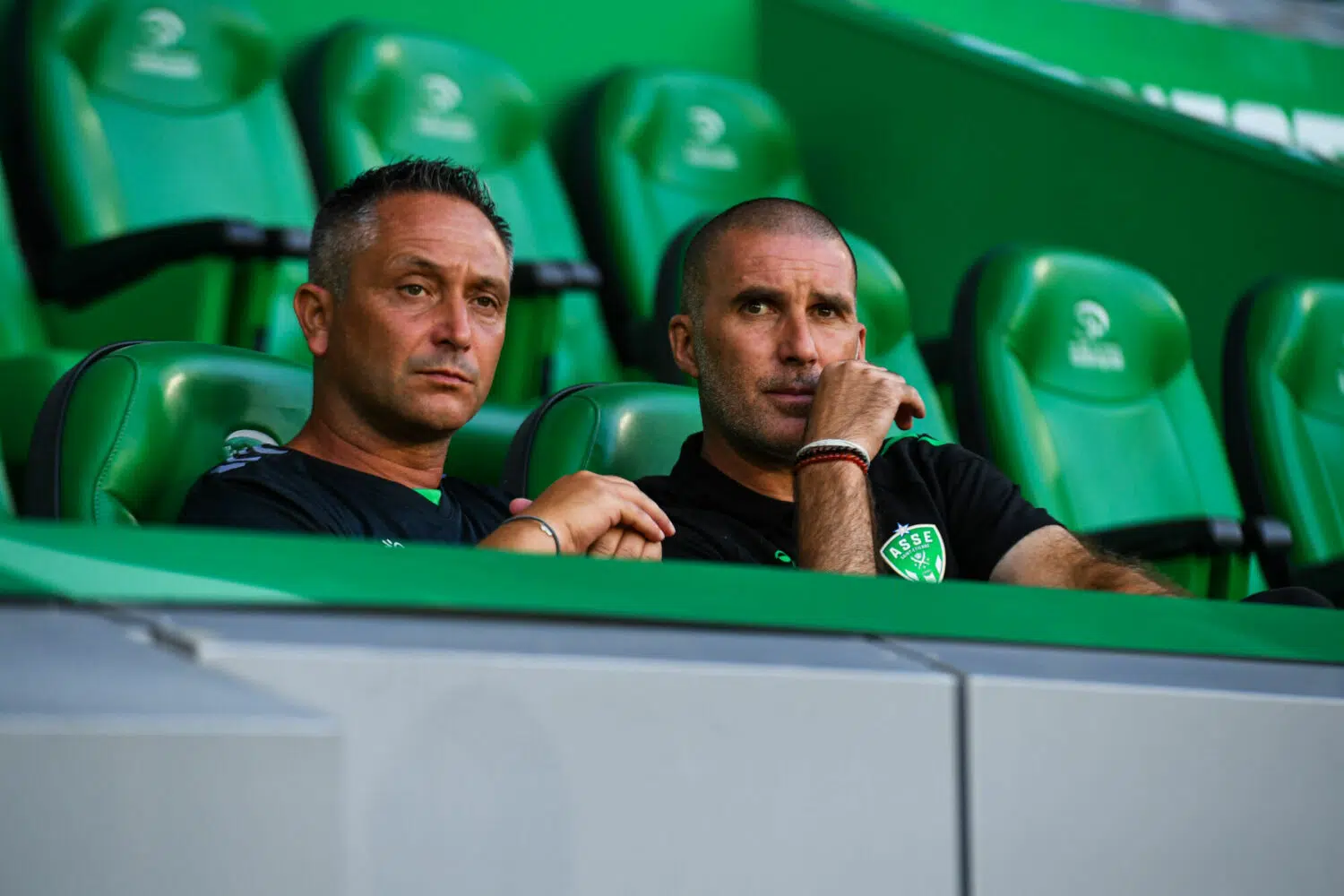 Headcoach of Saint Etienne Laurent BATLLES and Deputy coach of Saint Etienne Emmanuel DA COSTA during the Ligue 2 BKT match between Saint-Etienne and Quevilly-Rouen Metropole at Stade Geoffroy-Guichard on August 19, 2023 in Saint-Etienne, France. (Photo by Daniel Derajinski/Icon Sport)