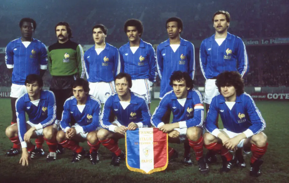 Marius TRESOR, Dominique BARATELLI, Manuel AMOROS, Gerard JANVION, Jean TIGANA, Christian LOPEZ, Gerard SOLER, Alain GIRESSE, Bernard LACOMBE, Michel PLATINI and Didier SIX of France during the friendly match between France and Italy at Parc des Princes stadium, Paris, in France on February 23rd, 1982. ( Photo by Gerard Bedeau / Onze / Icon Sport )