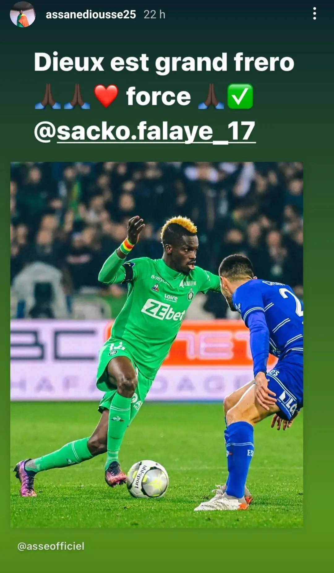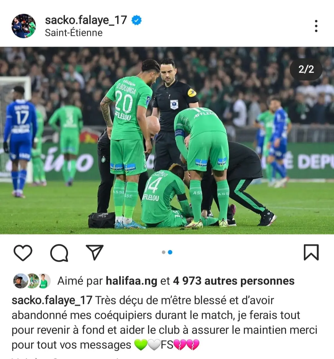 En attendant, le joueur a publié un message sur Instagram dans lequel il se dit déterminé pour "revenir à fond et aider le club à assurer le maintien". Certains de ses coéquipiers lui ont envoyé un message de soutien comme Assane Diousse ou Denis Bouanga... Bon rétablissement Falaye.
