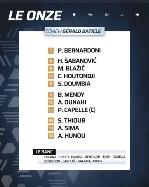 Laurent Batlles a dévoilé son dernier onze pour cette ultime rencontre amicale face à Angers. Neyou, sur le départ, est absent, tout comme Aouchiche. A noter la présence de denis Bouanga.