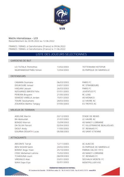 La sélection nationale U19 se réunira au mois du 30 mai au 12 juin à Clairefontaine. Qualifiée pour l'Euro, elle y disputera deux rencontres amicales face à l'Israël. Lucas Gourna participera au regroupement.