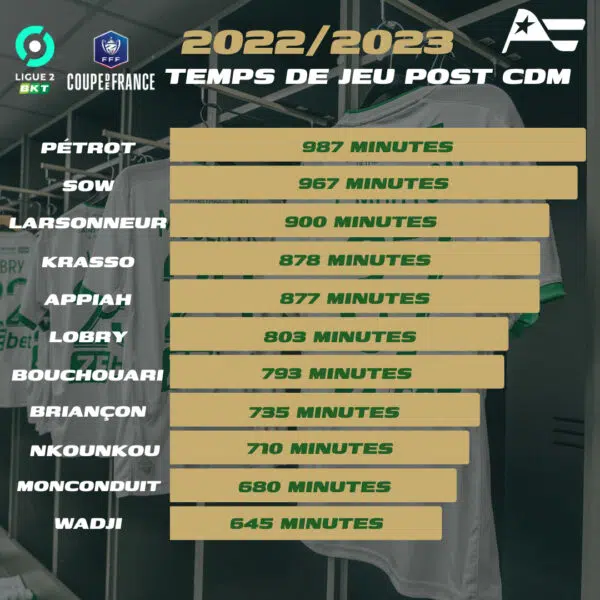 Les Verts sont sur une belle série de 6 matchs sans défaite, et la stabilité de l'équipe n'y est pas étrangère. Laurent Batlles garde la même ossature de matchs en matchs, se permettant de temps à autre quelques ajustements au niveau des noms couchés sur la composition d'équipe. Mais dans l'ensemble, le coach stéphanois a trouvé son équipe type et c'est visible au niveau des temps de jeu. Focus sur les temps de jeu depuis le début de saison.