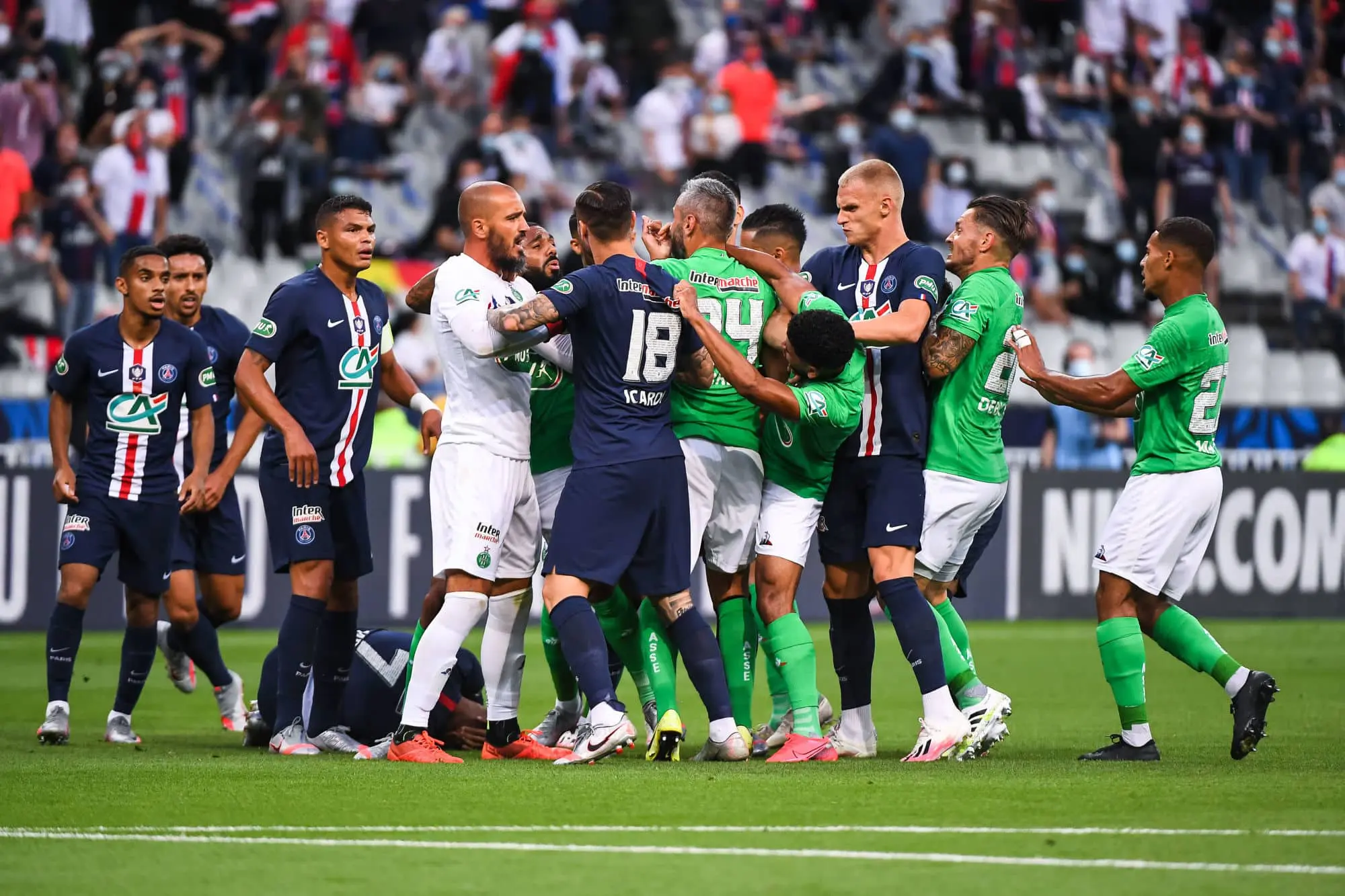Jessy MOULIN of Saint Etienne, Loic PERRIN of Saint Etienne, Kylian MBAPPE of Paris Saint Germain, Mauro ICARDI of Paris Saint Germain, Mitchel BAKKER of Paris Saint Germain during the French Cup Final soccer match between Paris Saint Germain and Saint Etienne at Stade de France on July 24, 2020 in Paris, France. (Photo by Baptiste Fernandez/Icon Sport) - Stade de France - Paris (France)