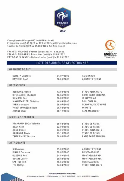 Ils seront en stage de préparation à l'Euro du 7 au 12 mai à Clairefontaine avant de s'envoler pour l'Israël. La dernière journée de championnat étant le 15 mai, ils ne pourront y participer. En effet, ils commenceront leur campagne de phase de poules de l'Euro. Ils affronteront tour à tour la Pologne, la Bulgarie et les Pays-Bas. Il faudra finir dans les deux premiers pour se qualifier pour les phases finales. Les quarts de finales se joueront le 25-26 mai, les demis le 29 mai et la finale le 1er juin. Nous souhaitons bonne chance à Noah Raveyre et Ayman Aiki. Nous espérons qu'ils portent le plus haut possible la formation verte et blanche.