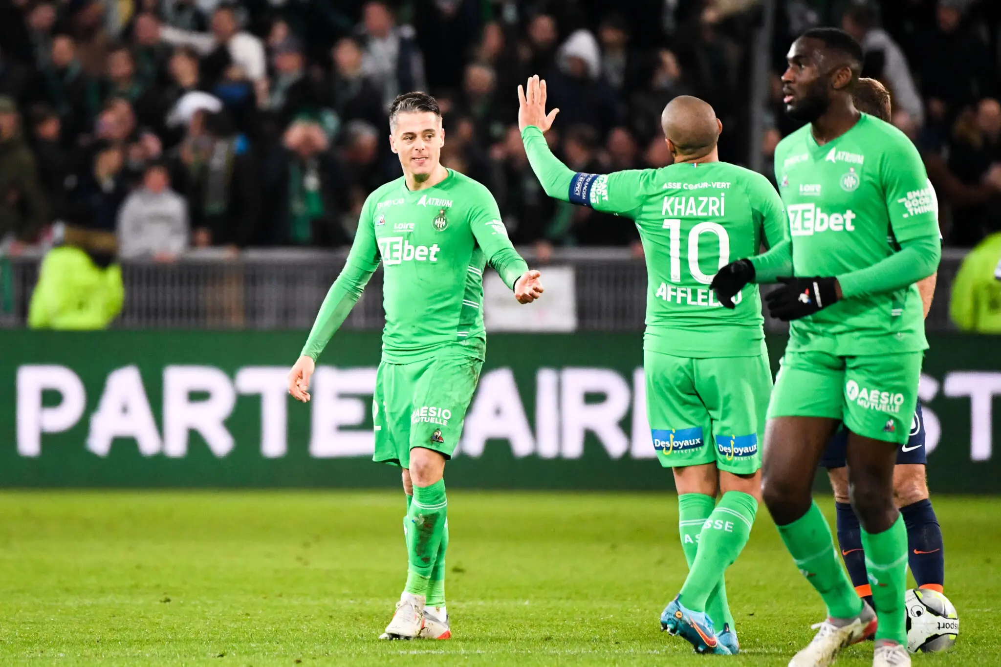 Wahbi KHAZRI of Saint Etienne goal and Denis BOUANGA of Saint Etienne and Romain HAMOUMA of Saint Etienne and Mathieu DEBUCHY Saint Etienne during the Ligue 1 match between Saint-Etienne and Bordeaux at Stade Geoffroy-Guichard on April 11, 2021 in Saint-Etienne, France. (Photo by Romain Biard/Icon Sport) - Romain HAMOUMA - Wahbi KHAZRI - Mathieu DEBUCHY - Denis BOUANGA - Stade Geoffroy-Guichard - Saint Etienne (France)