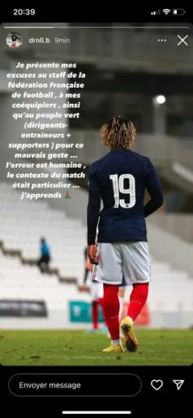 De son côté, Darnell Bile a tenu à publier un message d'excuses qu'il adresse à la Fédération, au club et aux supporters : "Je présente mes excuses au staff de la fédération Française de Football, à mes coéquipiers, ainsi qu'au peuple vert (dirigeants, entraîneurs et supporters) pour ce mauvais geste... L'erreur est humaine, le contexte du match était particulier... J'apprends"