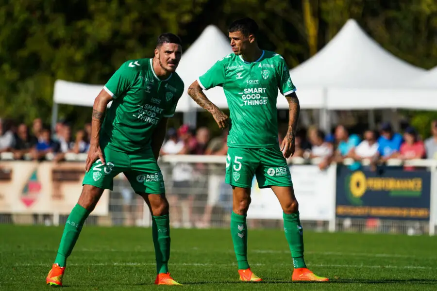 Anthony BRIANCON of Saint Etienne and Jimmy GIRAUDON of Saint Etienne during the friendly match between Angers and Saint Etienne at Stade Raymond Kopa on July 23, 2022 in Angers, France. (Photo by Eddy Lemaistre/Icon Sport)