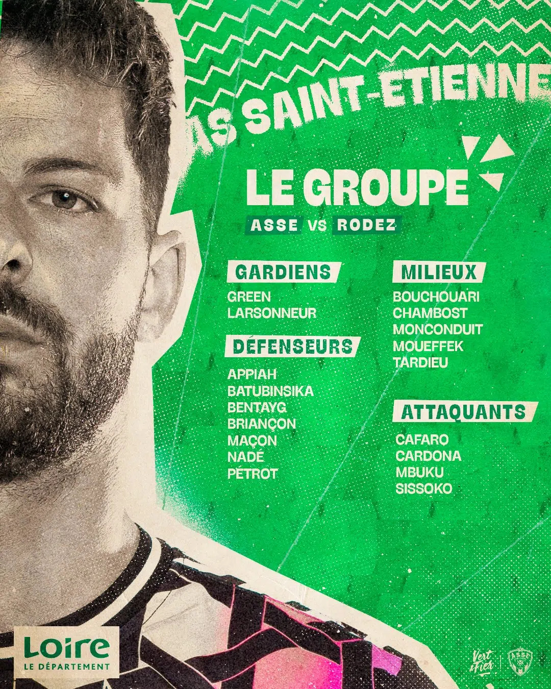 Match couperet pour l'ASSE et Rodez. L'AS Saint-Etienne reçoit le RAF ce vendredi soir. Deux semaines après la J37 de Ligue 2 BKT, les stéphanois devront l'emporter cette fois pour continuer à rêver de la Ligue 1. Voici le groupe retenu par Olivier Dall'Oglio.