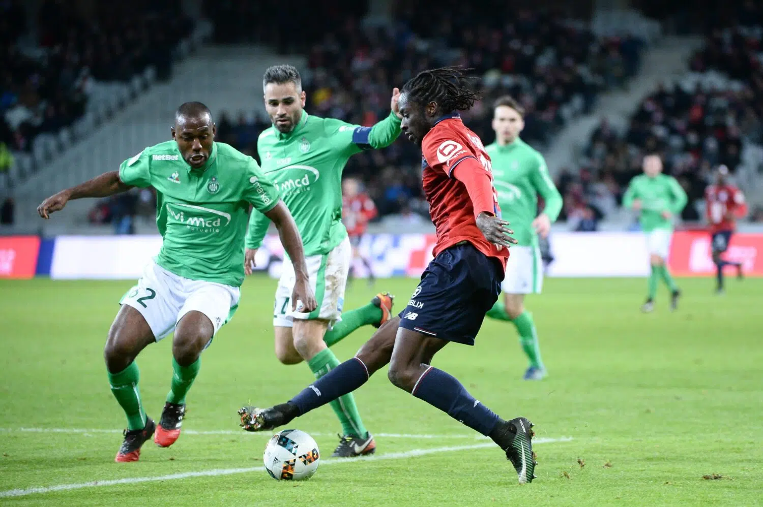 Eder of Lille Loic Perrin of Saint Etienne Kevin Theophile Catherine of Saint Etienne (R-L) during the Ligue 1 match between Liile OSC and As Saint Etienne at Stade Pierre-Mauroy on January 13, 2017 i