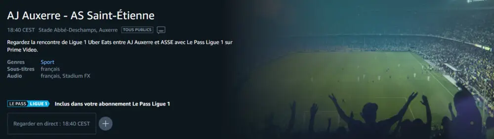 La rencontre Auxerre - ASSE sera disponible sur la plateforme AMAZON PRIME Vidéo via le Pass Ligue 1. Prise d'antenne à 18h40 pour la présentation du match.