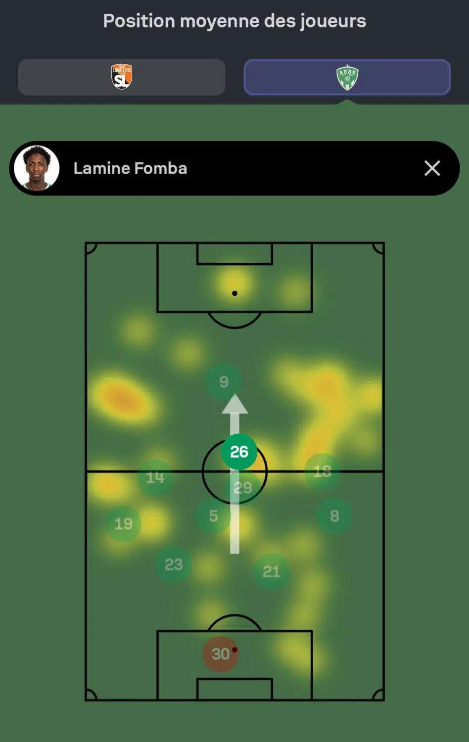 Les Verts virent souvent Fomba jouer plus haut (4-2-3-1/ 4-2-1-3) pour trouver une possibilité une fois le milieu de terrain adverse passé.