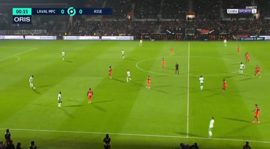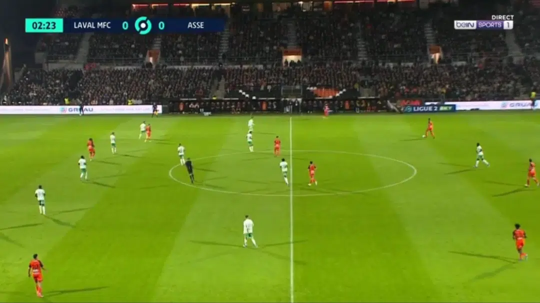 Sans ballon, les Verts ont recherché à bloquer le jeu axial avec les relayeurs stéphanois très proches des milieux lavallois.