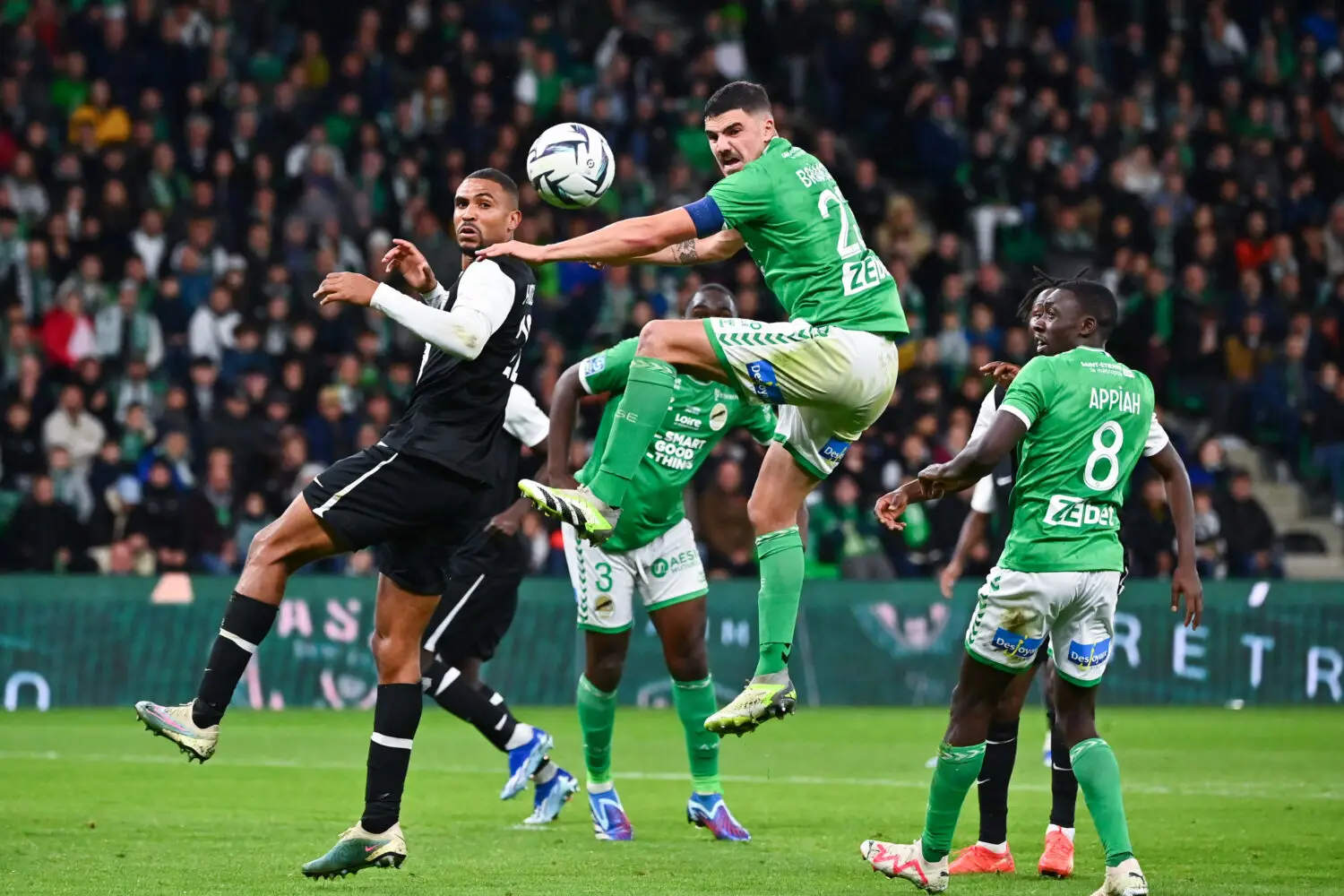 Cedric HOUNTONDJI of Angers Sco and Anthony BRIANCON of Saint Etienne during the Ligue 2 BKT match between Association Sportive de Saint-Etienne and Angers Sporting Club de l'Ouest at Stade Geoffroy-Guichard on October 30, 2023 in Saint-Etienne, France. (Photo by Anthony Dibon/Icon Sport)