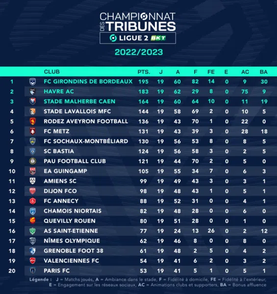 "Pour la saison 2022/2023, le règlement du Championnat des Tribunes comporte de nombreuses évolutions en termes de pondération et de modalités de valorisation des critères retenus. Ainsi, lors de chaque journée de Ligue 2 BKT, un maximum de 47 points lors d’une rencontre à domicile et de 3 points lors d’une rencontre à l’extérieur sont répartis selon cinq critères de notation, impliquant simultanément les clubs, les supporters, les délégués de la LFP et les diffuseurs des rencontres :