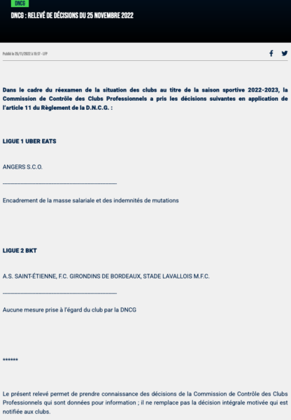 "Ce vendredi 25 novembre, dans le cadre du réexamen de la situation des clubs au titre de la saison sportive 2022-2023 et en application de l’article 11 du Règlement de la D.N.C.G, la Commission de Contrôle des Clubs Professionnels n'a pris aucune mesure à l’égard de l'AS Saint-Étienne."