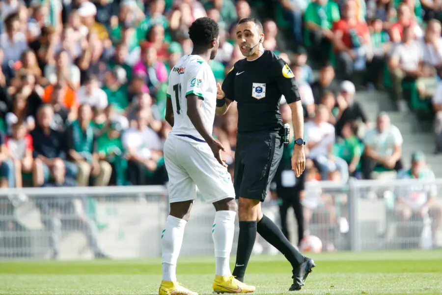 Referee Faouzi BENCHABANE and Lenny PINTOR of Saint Etienne during the French Cup match between AS Saint-Etienne and Rodez Aveyron at Stade Geoffroy-Guichard on October 29, 2022 in Saint-Etienne, France. (Photo by Romain Biard/Icon Sport)