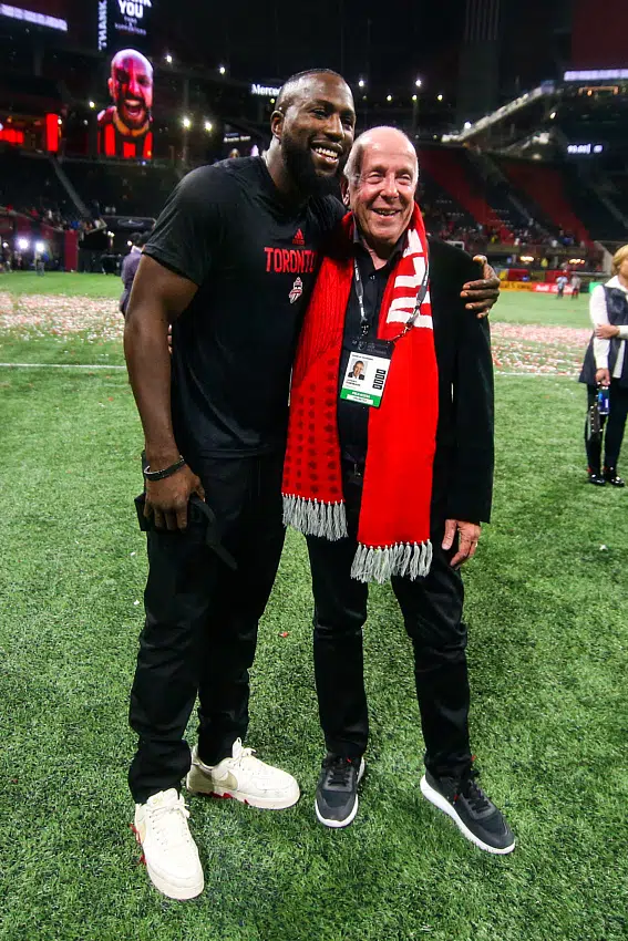 Oct 30, 2019; Atlanta, GA, USA; Toronto FC forward Jozy Altidore (17) and board member Larry Tanenbaum celebrate after a victory against Atlanta United.