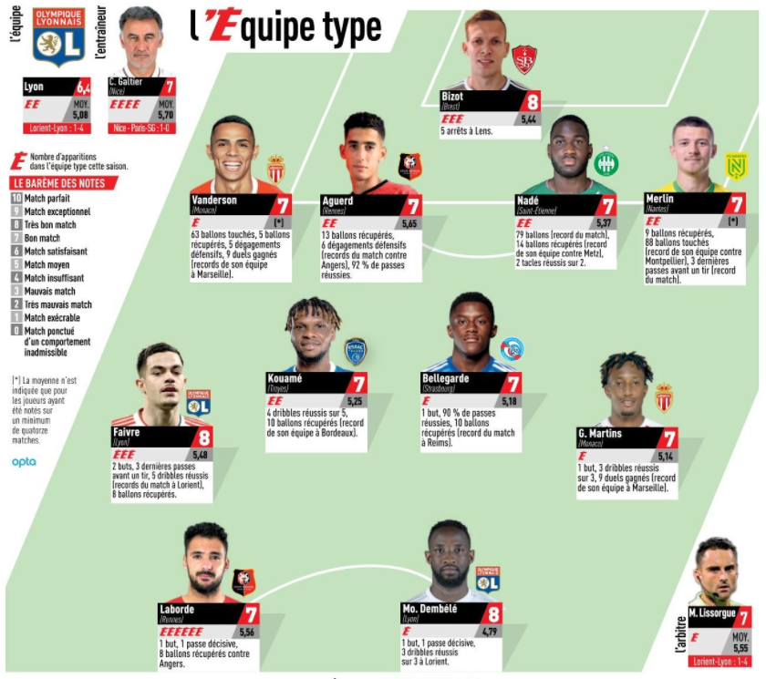 Encore l'auteur d'une prestation très aboutie, Mickael Nadé apparaît pour la seconde fois de la saison dans l'équipe-type d'une journée de championnat. Auréolé d'un 7/10, il compose avec le rennais Aguerd la paire de défenseurs centraux de cette 27ème journée de championnat.