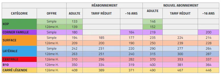 Les tarifs varient selon la tribune choisie et l’offre sélectionnée : abonnement simple ou formule “12ème Homme”, cette dernière incluant des avantages comme 15 % à la boutique, une visite du musée ou un accès complet à ASSE.TV.