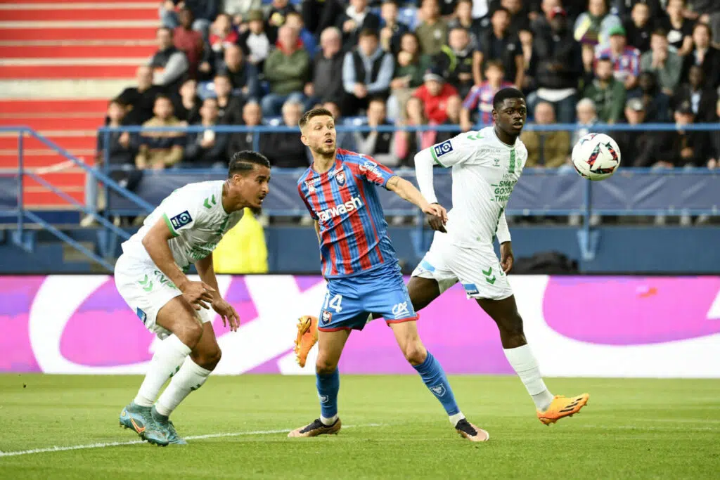 14 Anton JONSSON SALETROS (smc) - 04 Saidou SOW (asse) during the Ligue 2 BKT match between Caen and Saint-Etienne at Stade Michel D'Ornano on May 26, 2023 in Caen, France. (Photo by Christophe Saidi/FEP/Icon Sport)
